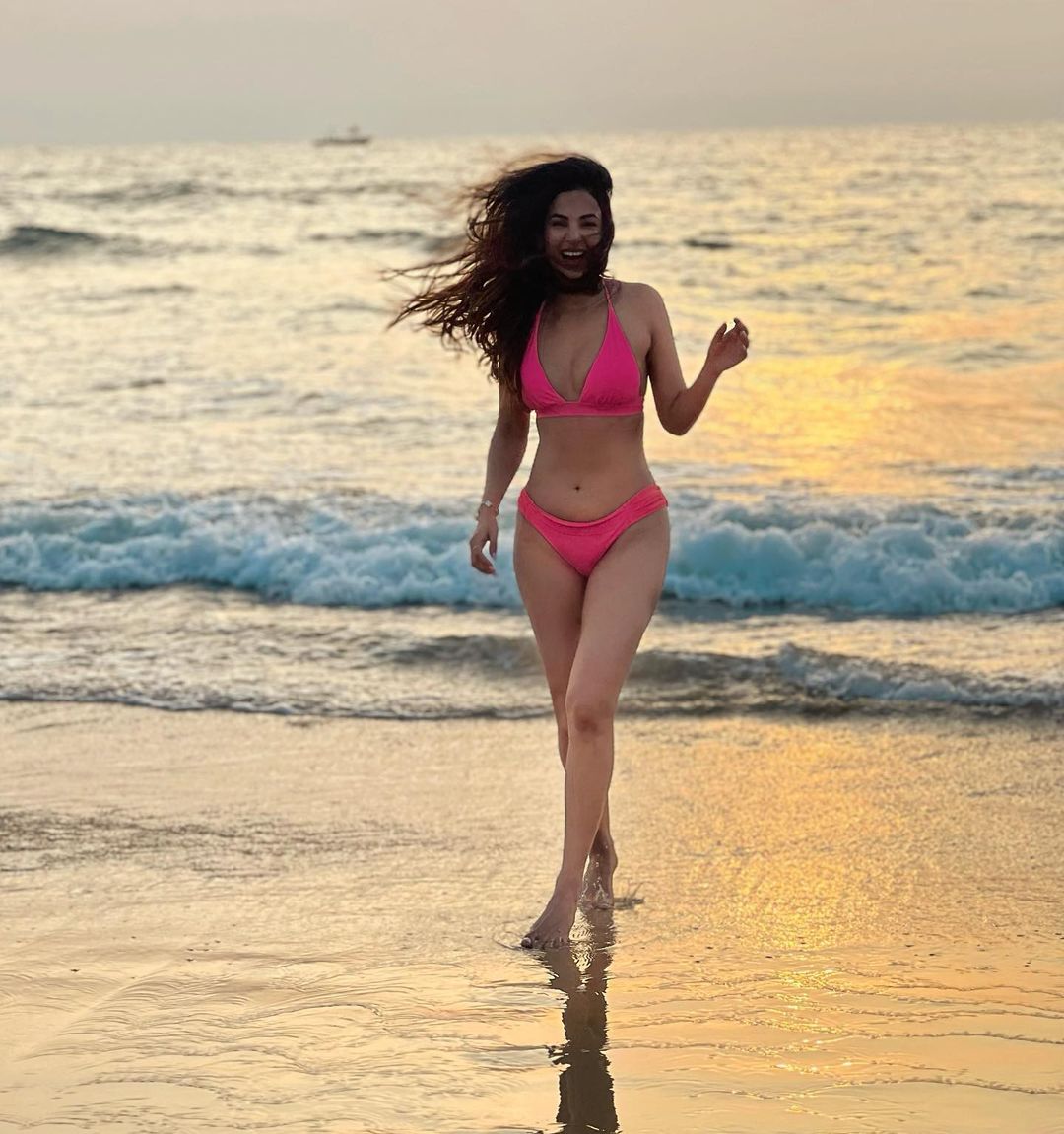 Sonal Chauhan looks sexy in the bikini as she poses during sunset hours