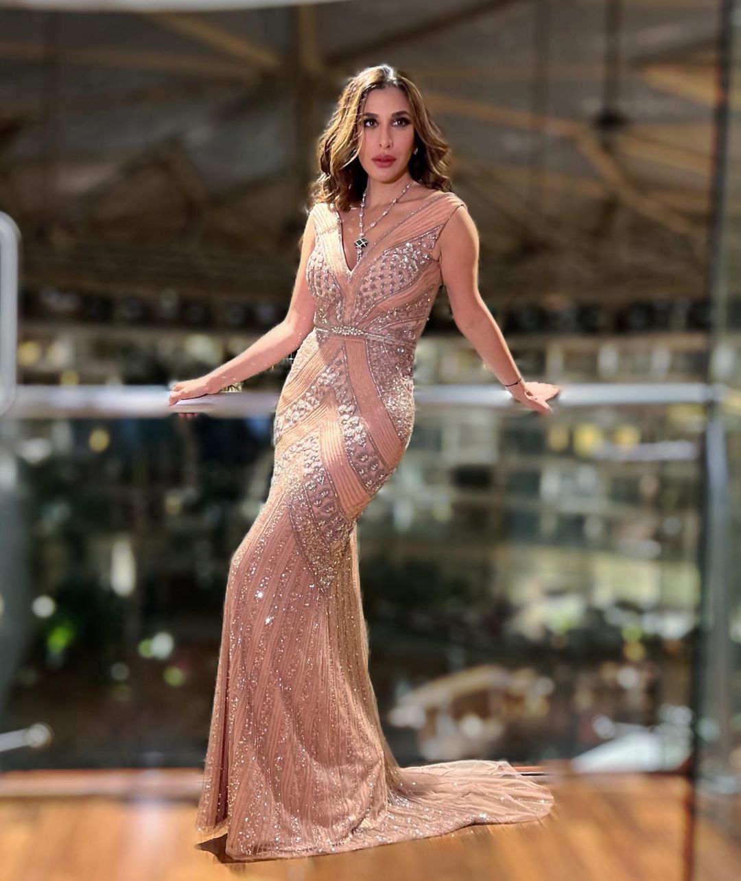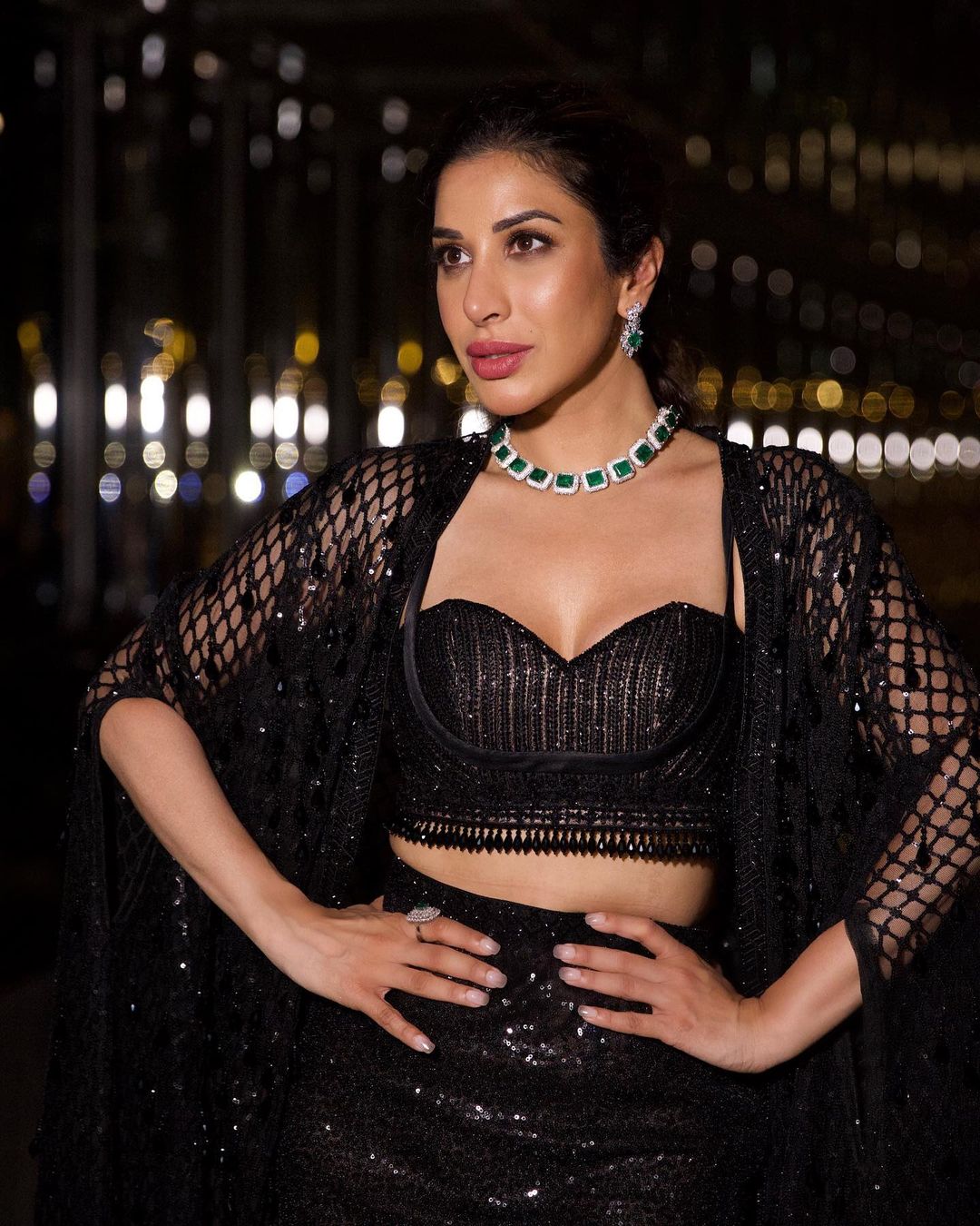 Sophie Choudry looked gorgeous in the draped skirt with an embellished top with a plunging neckline