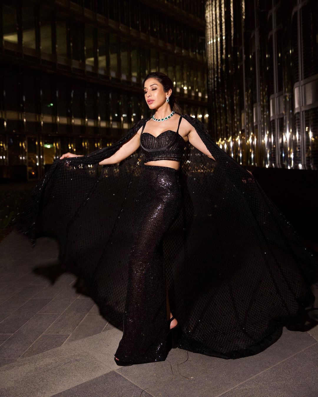 Sophie Choudry cuts a striking figure in a black sequinned outfit