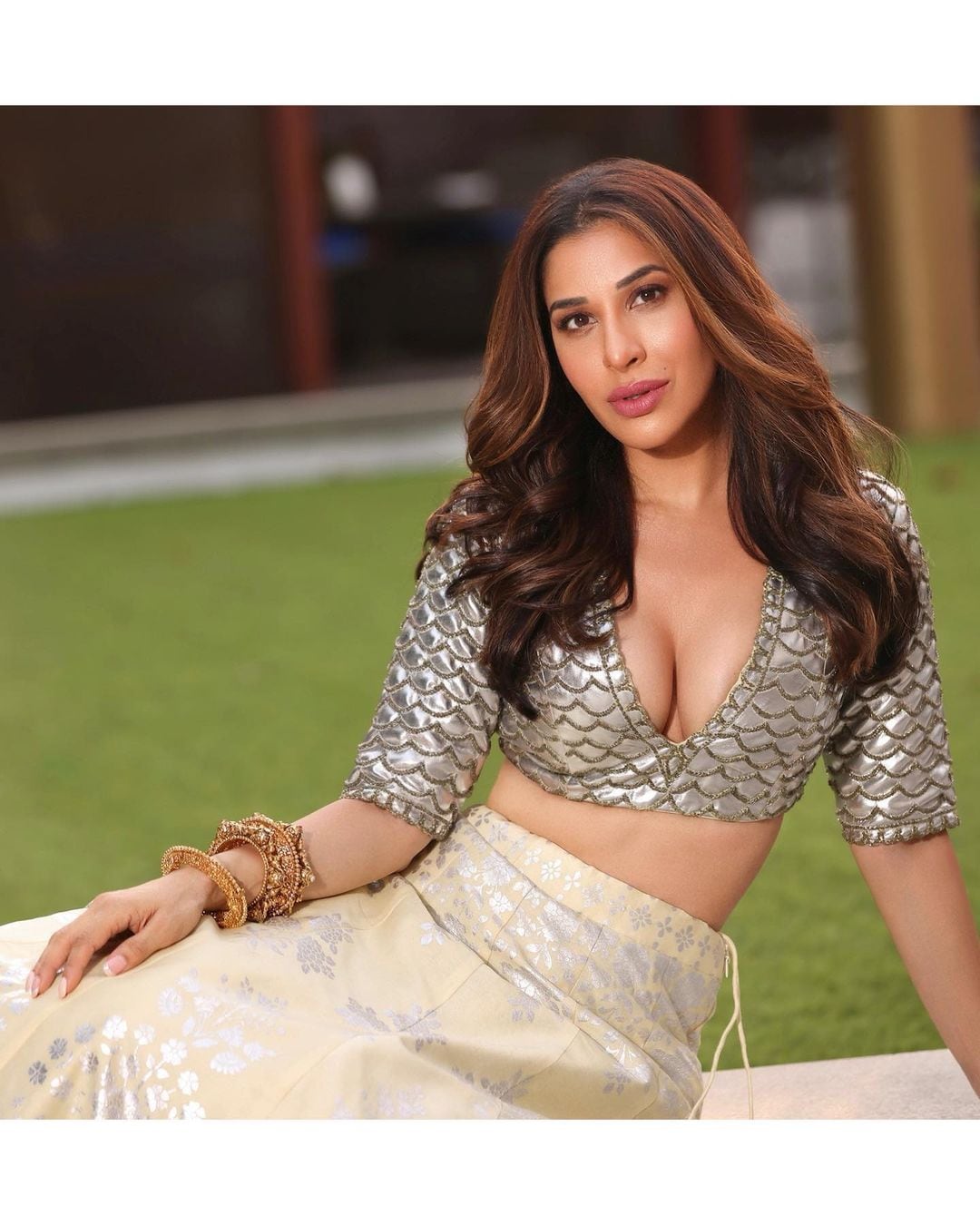 Sophie Choudry looks sizzling in the cleavage-baring blouse and off-white lehenga