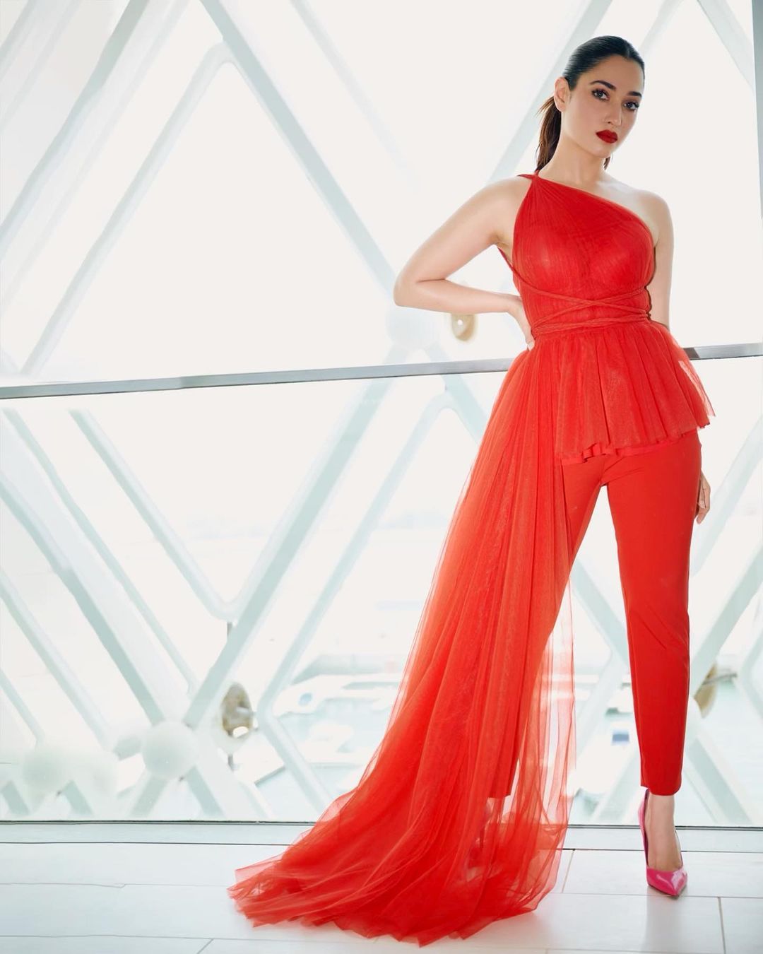 Tamannaah Bhatia looks sexy in the red jumpsuit with a tulle train