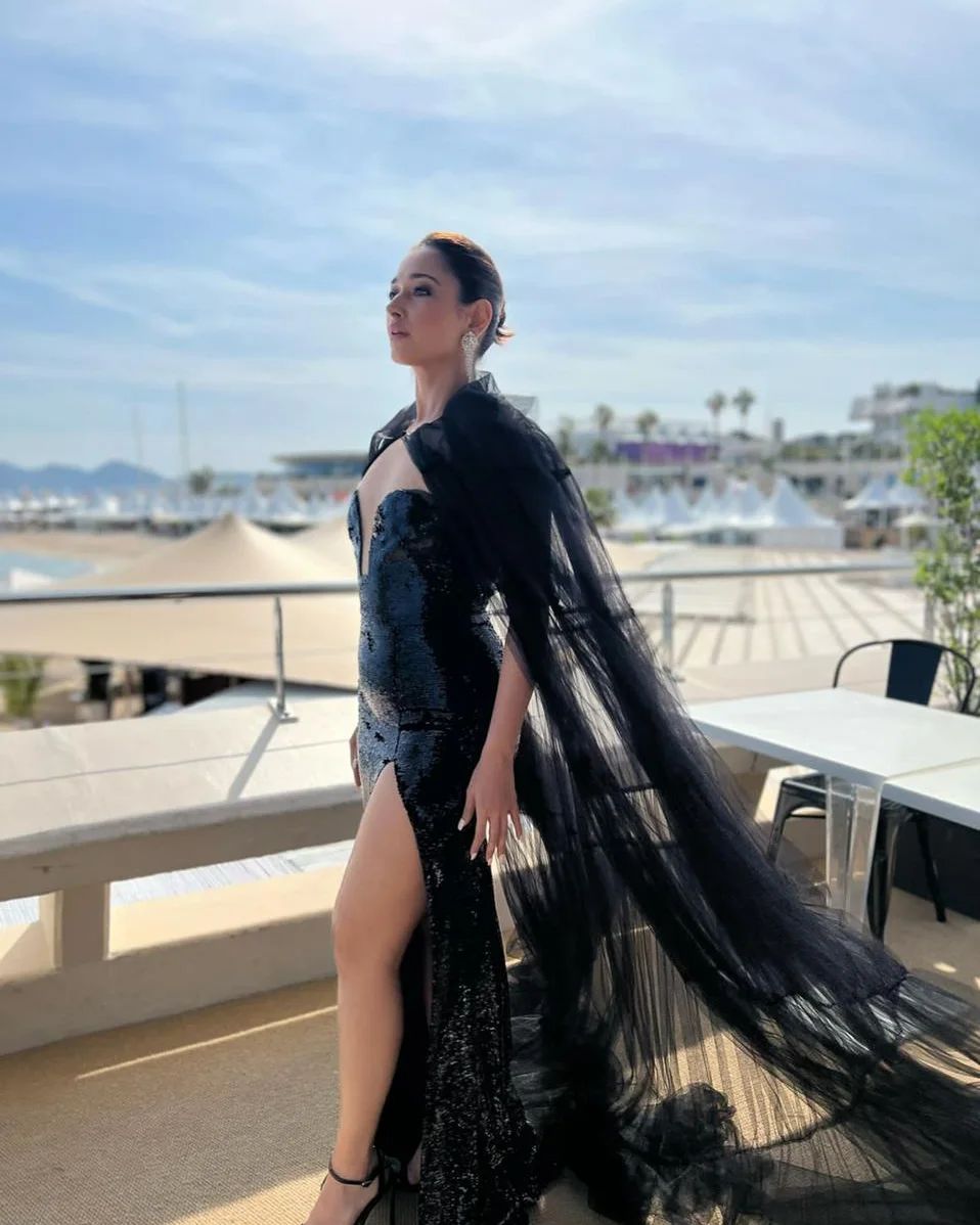 Tamannaah Bhatia looked sexy in the shimmery black slit dress with a semi-sheer cape.