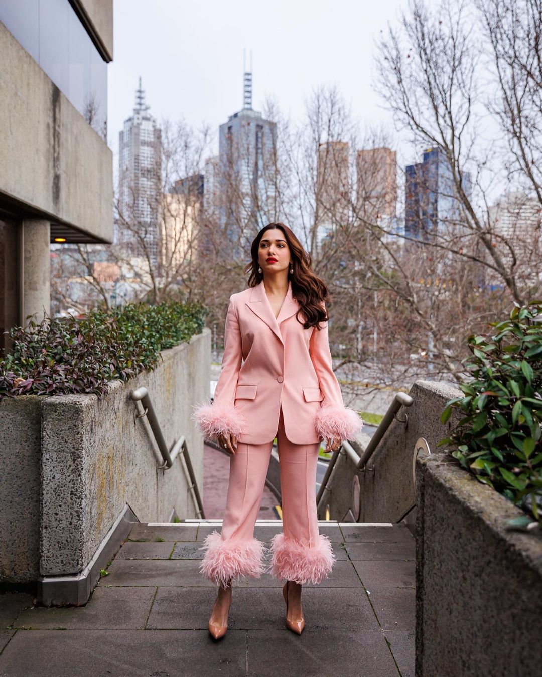 Tamannaah Bhatia in a pink pantsuit with feather highlights is a gorgeous sight to behold