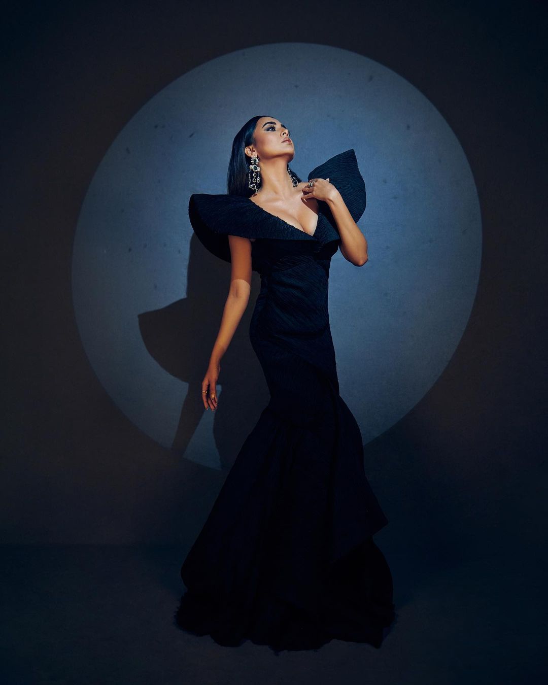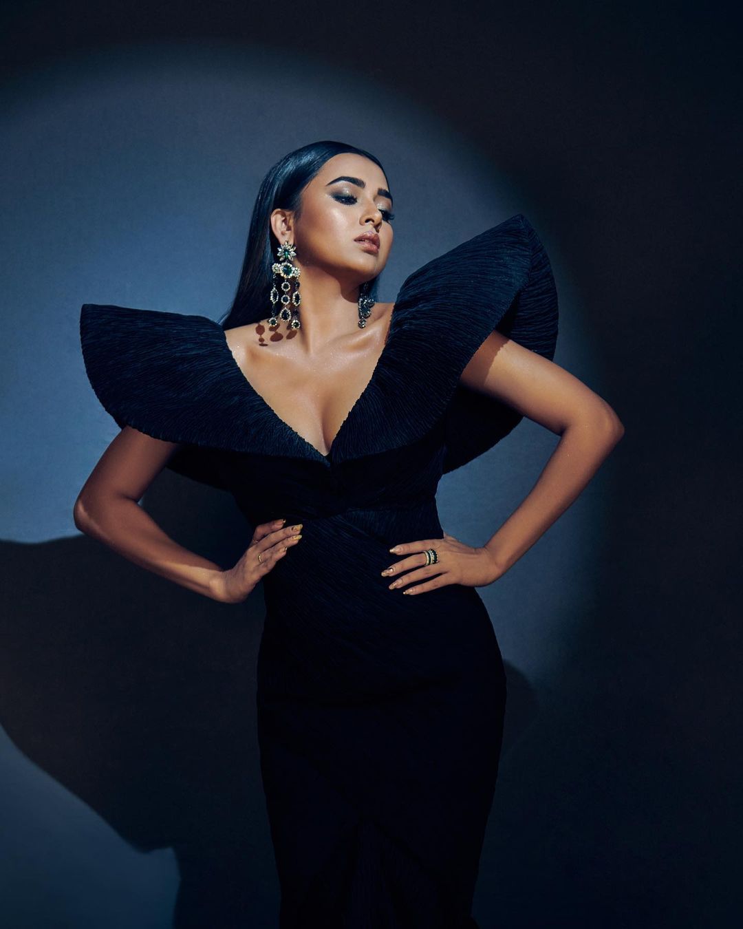 Tejasswi Prakash looks striking in the blue gown with statement sleeves.