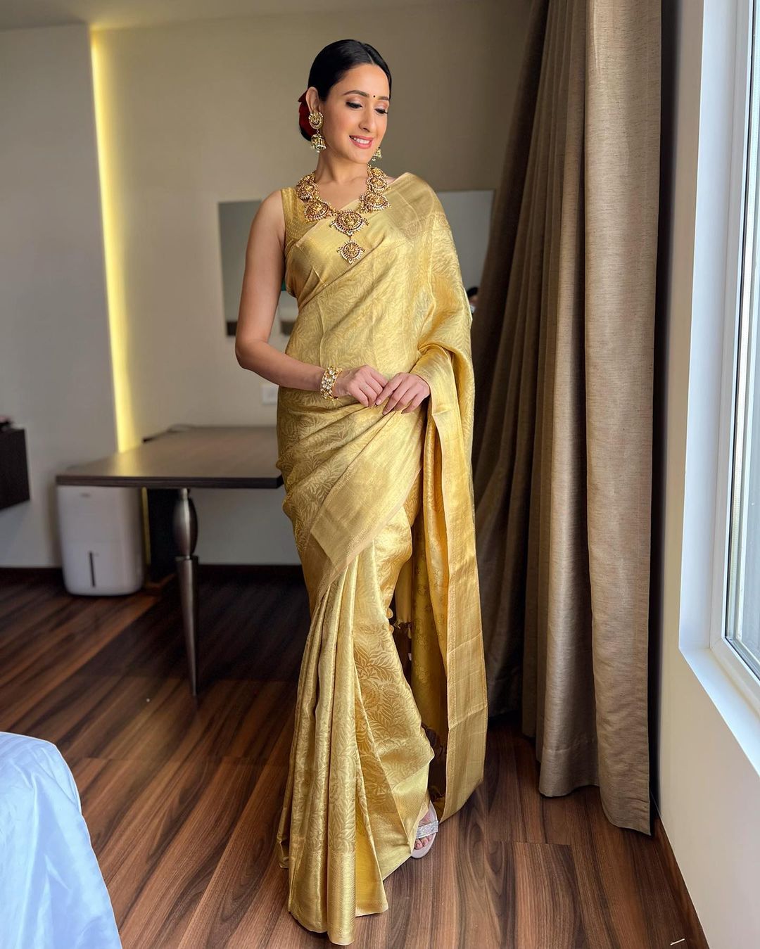 Pragya Jaiswal looks flawless in the golden silk saree