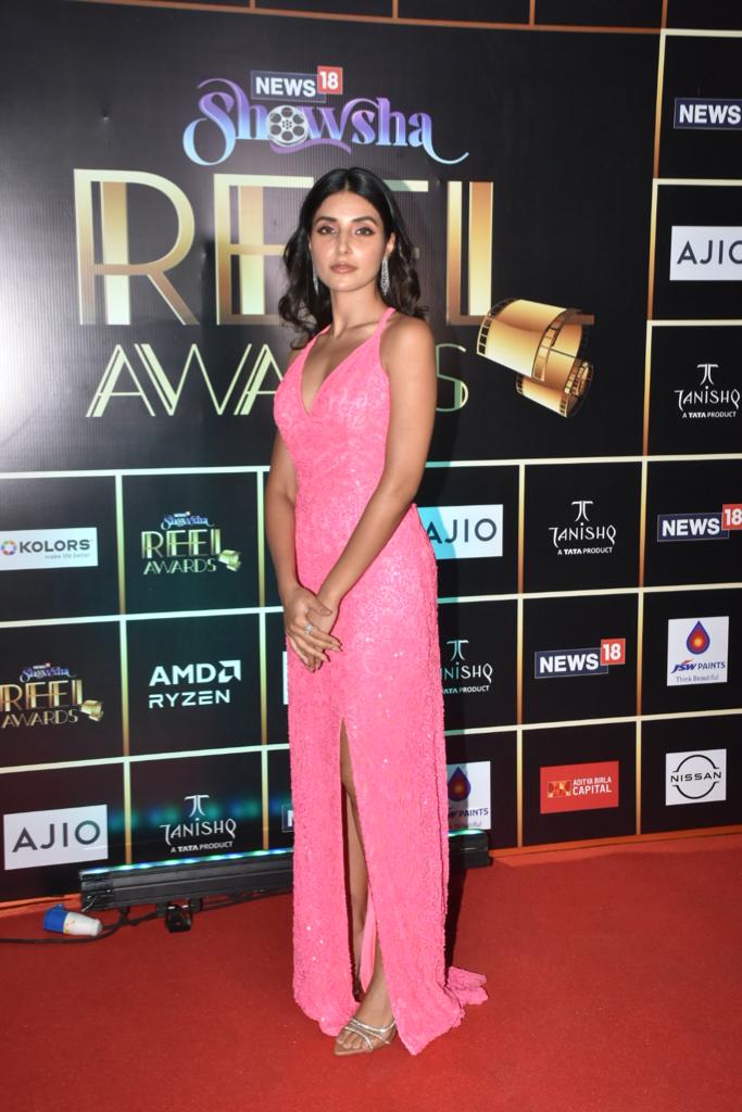 Harshita Gaur in pink shimmery dress at the News18 Showsha Reel Awards 2023