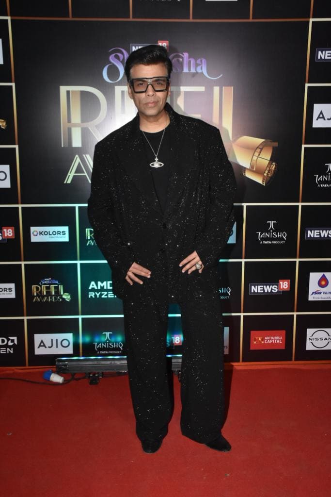Karan Johar in shimmery black suit at the News18 Showsha Reel Awards 2023