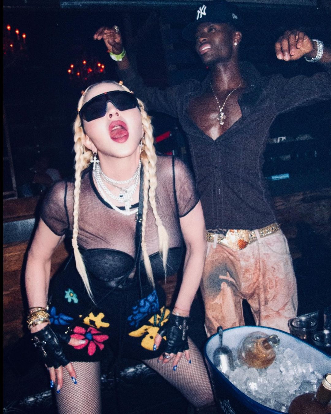 In blonde plaited hair, black gloves cut at the fingers, and a black dress with floral design, the singer can be seen partying and enjoying with a drink. #madonna #1080x1350 File type: jpg Original size: 1080x1350 Download