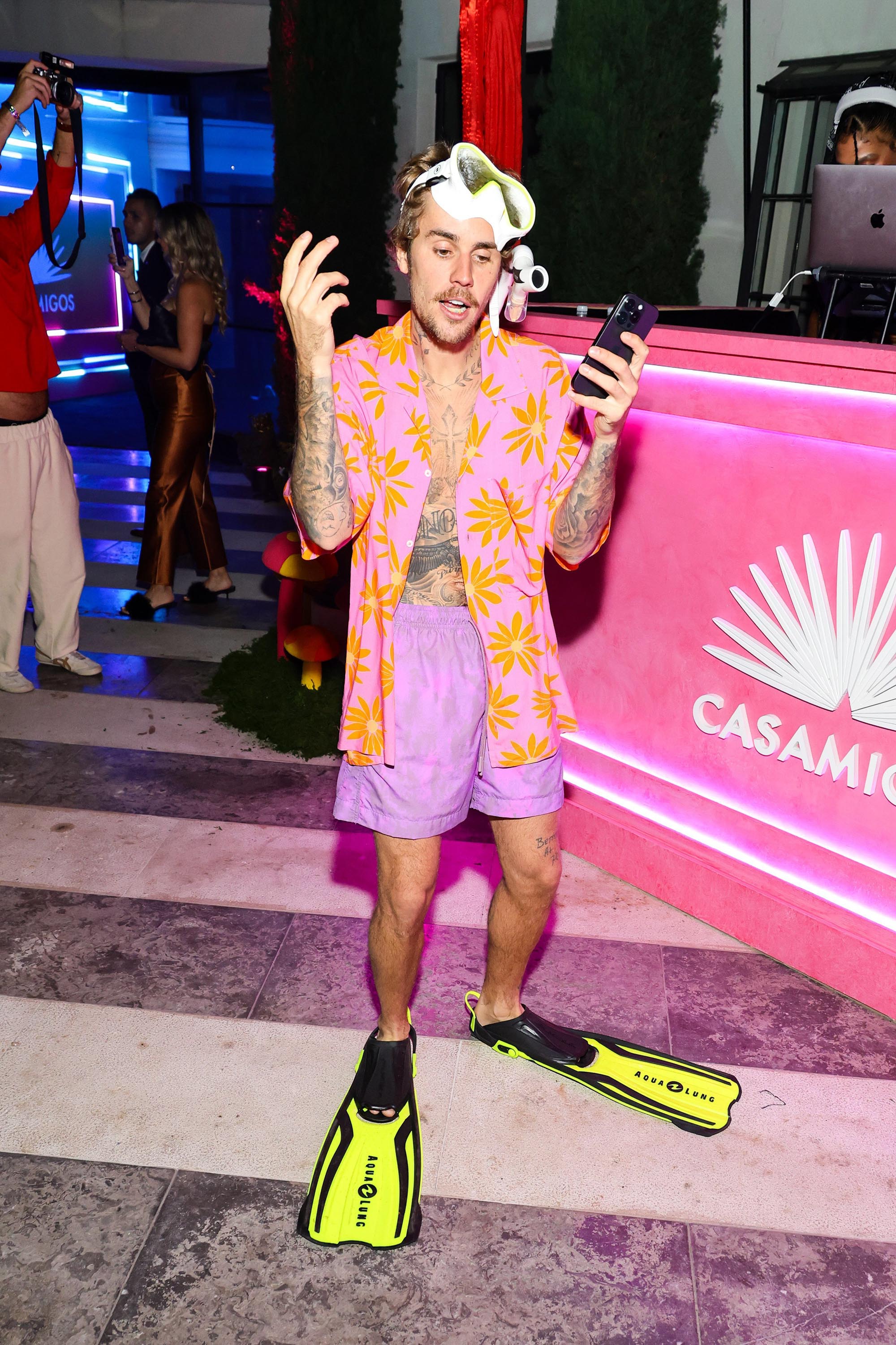 Justin Bieber wore a pink and orange Hawaiian shirt with a snorkel and flippers. #justin bieber #2000x3001 File type: jpg Original size: 2000x3001 Download