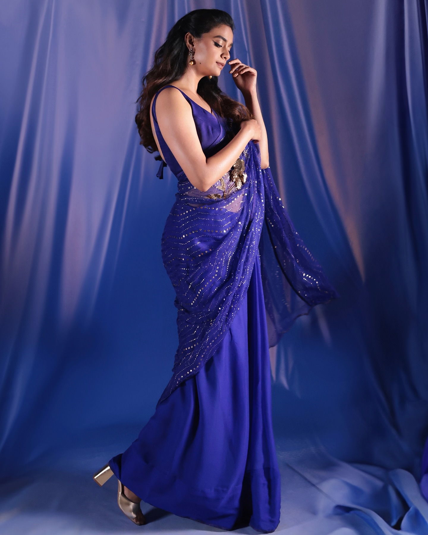 Keerthy Suresh wore this stunning outfit while promoting her latest film, "Raghu Thatha". Her pictures in the blue saree created a buzz on social media, with many admiring her fashion sense. #keerthy suresh saree #1440x1800 File type: jpg Original size: 1440x1800 Download