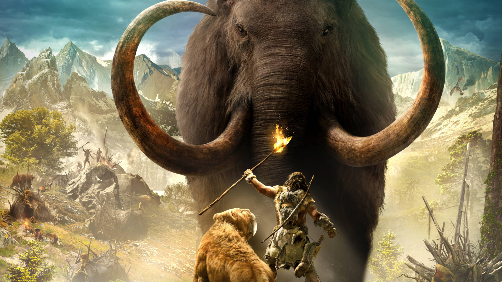 Mammoth Charging At A Man Holding A Fire Stick With A Sabretooth Beside Him