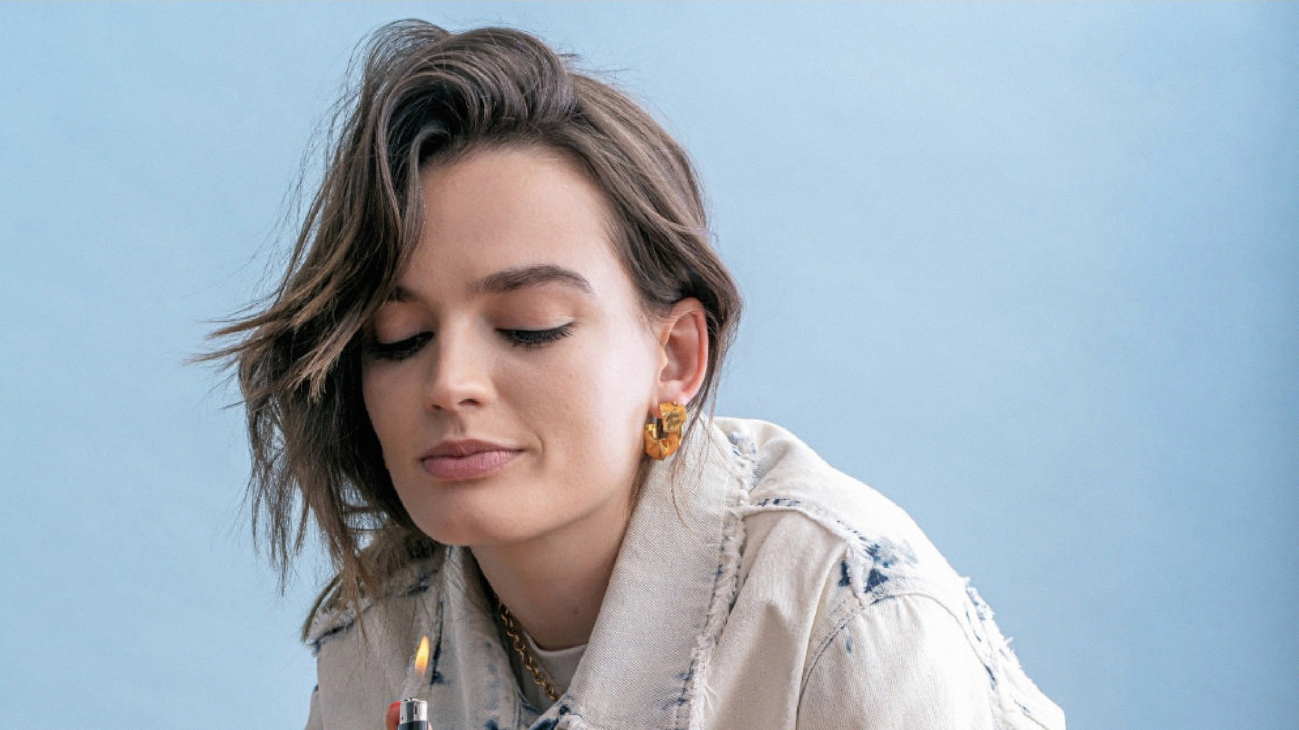 A Fashion Photo Of Popular Actress, Emma Mackey, Wearing An Acid Wash Denim Jacket