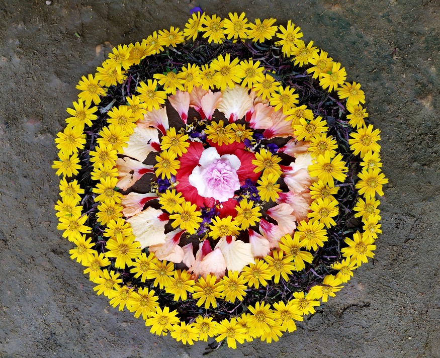 Pookalam is a must-have during Onam celebrations (also spelt as Pookolam). Pookolam/Pookalam is made up of two words: 'Poo' (flowers) and 'Kolam' (flowers) (decorative pattern or rangoli)
